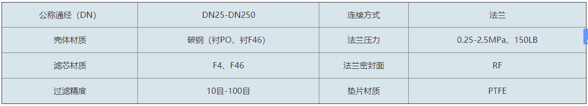襯氟籃式過濾器是本廠根據客戶使用要求結合過濾器和氟塑料襯里閥門的優點研發的一種新型的過濾器產品。本產品適用于:各種濃度的鹽酸、硫酸、氫氟酸以及王水、硝酸、各種有機酸、強堿、強氧化劑或弄稀硫酸交替、各種有機溶劑和除熔融堿金屬、元素氟及芳香烴類外的氣體強腐蝕性介質(注:不同的襯里材料適用介質有所不同)。本產品殼體材質以碳鋼內襯氟塑料,濾網材質為F46、F4等材質。本產品具有耐腐蝕強、過濾效率高、維護方便等優點。