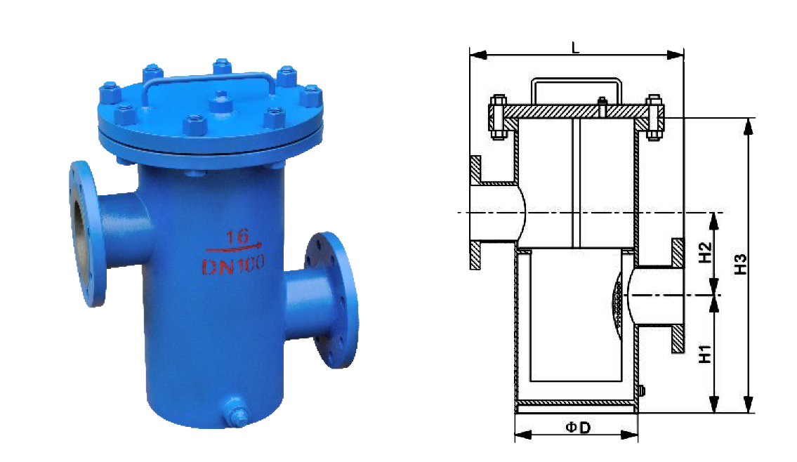 高低籃式過濾器主要由進出口的接管和法蘭、筒體、濾籃、筒體法蘭、筒體法蘭蓋及緊固件等組成。當液體通過進口進去筒體流經濾籃后, 固體雜質顆粒被阻攔在濾籃內,而潔凈的流體通過濾