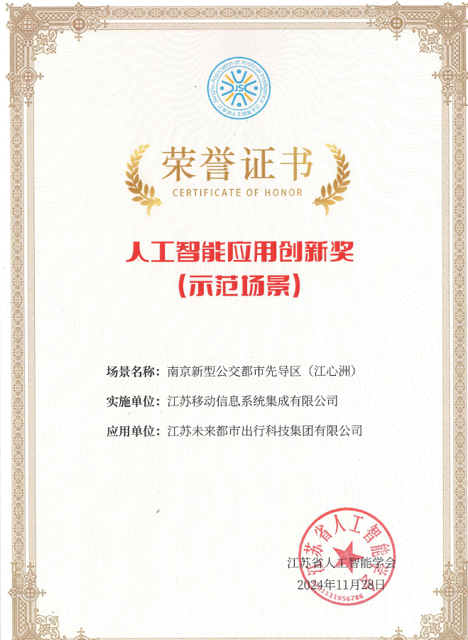 近日,江蘇省人工智能學(xué)會(huì)組織專家評(píng)審,對(duì)2024年度江蘇省人工智能學(xué)會(huì)科技成果獎(jiǎng)授獎(jiǎng)項(xiàng)目名單進(jìn)行公示,由江蘇未來(lái)都市出行科技集團(tuán)打造的“新型公交都市先導(dǎo)區(qū)(江心洲)” 項(xiàng)目入圍人工智能應(yīng)用創(chuàng)新獎(jiǎng)(示范場(chǎng)景)名單。這是繼去年獲獎(jiǎng)后,出行公司再次獲得該項(xiàng)榮譽(yù)。