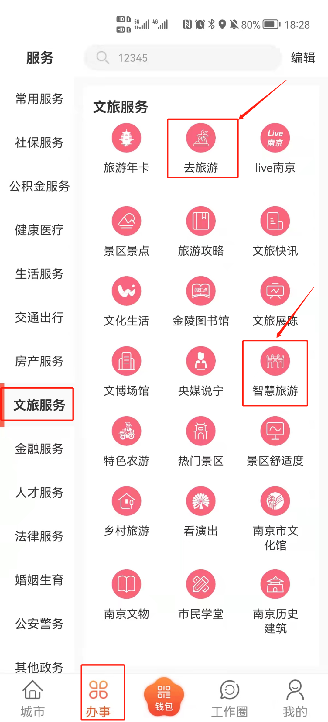 打開“我的南京”APP,點擊辦事頁-文旅服務板塊,即可根據自己需要選擇去旅游、智慧旅游等應用服務即可。